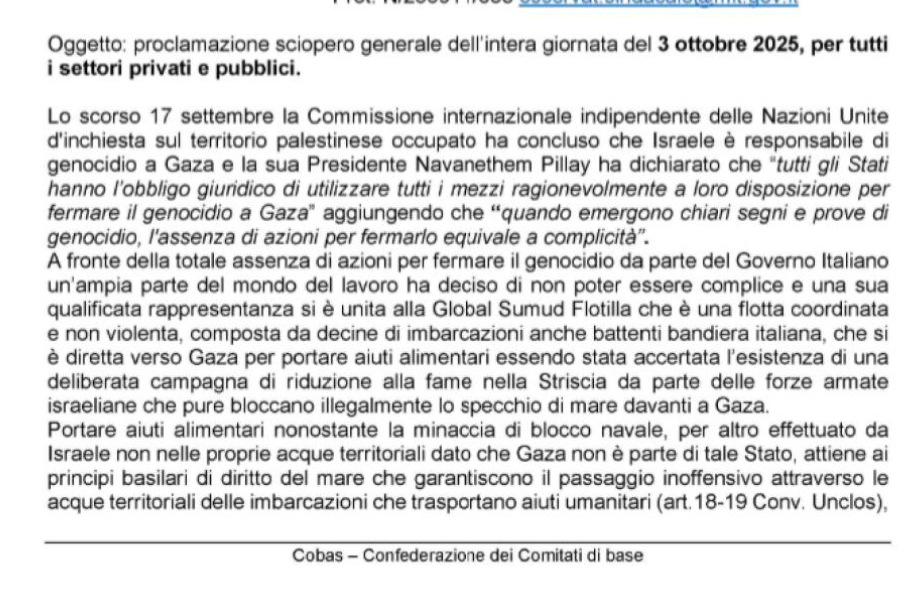 Cobas – Sciopero generale venerdì 3 ottobre 2025.
